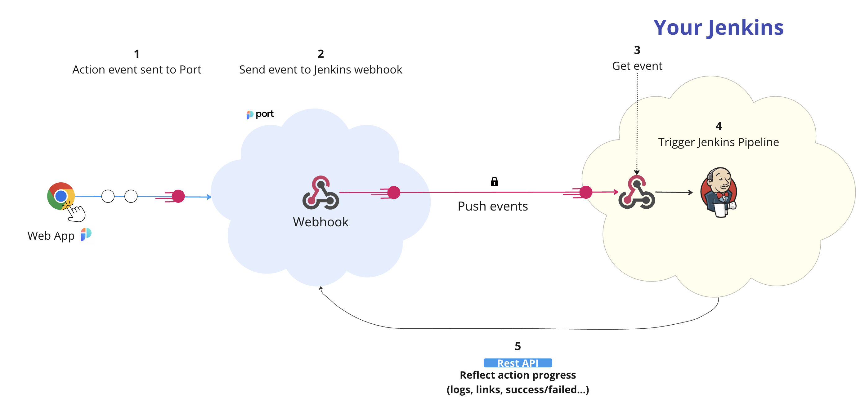 • Port sends a POST request with the action payload to the Jenkins webhook URL.