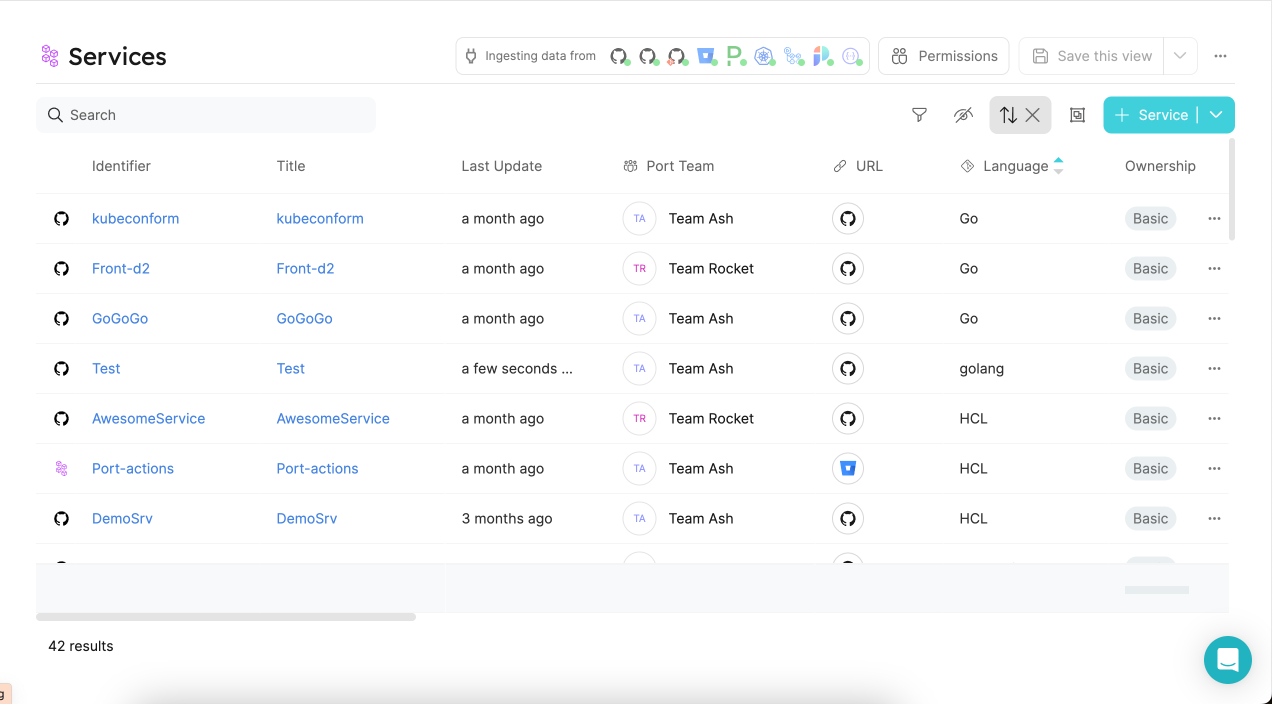 For example, once you complete Port's onboarding process and connect your Git provider to Port, a new Services page will be created in your software catalog, populated with entities representing your services (Git repositories):