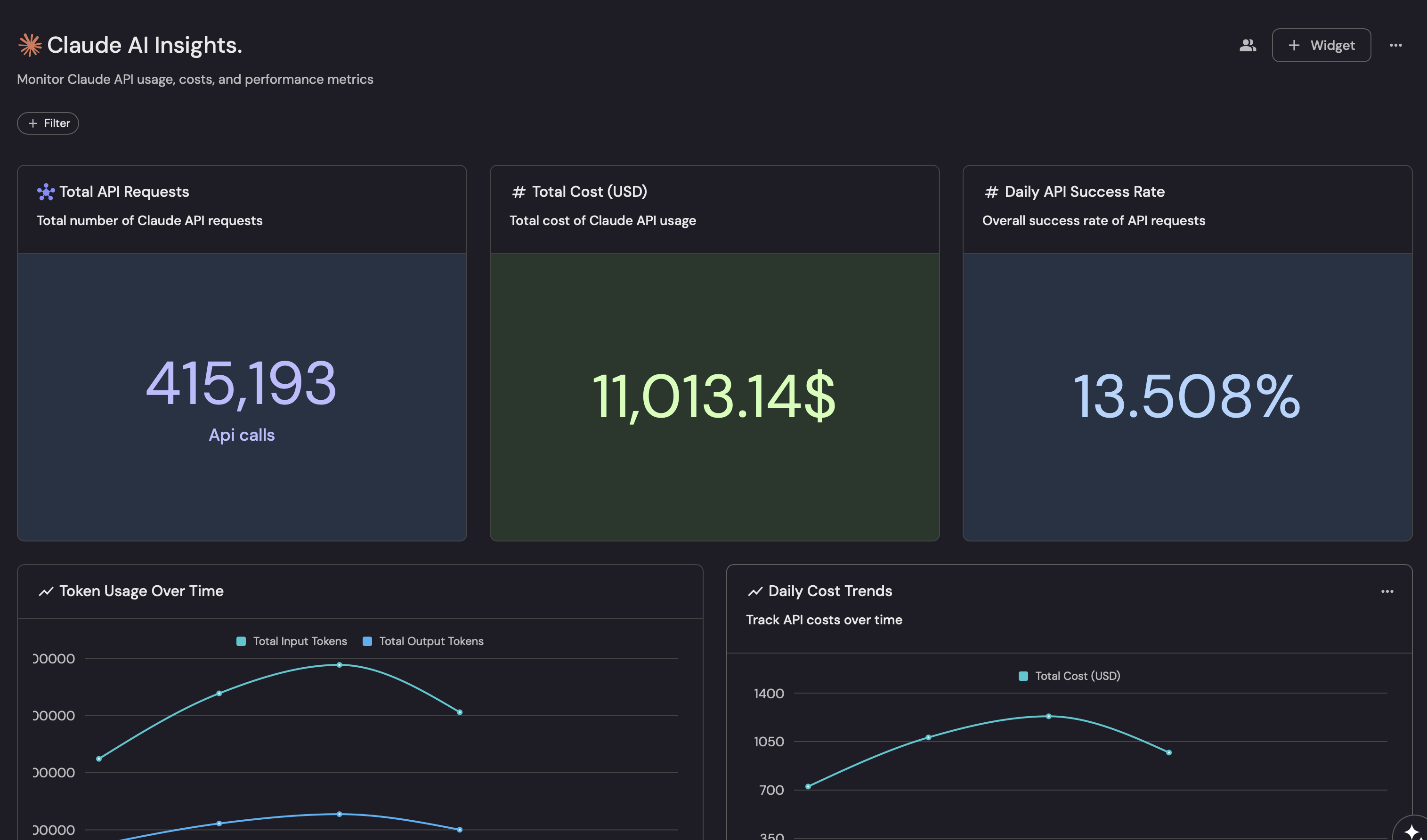 You now have a blank dashboard where you can add widgets to visualize your Claude metrics.