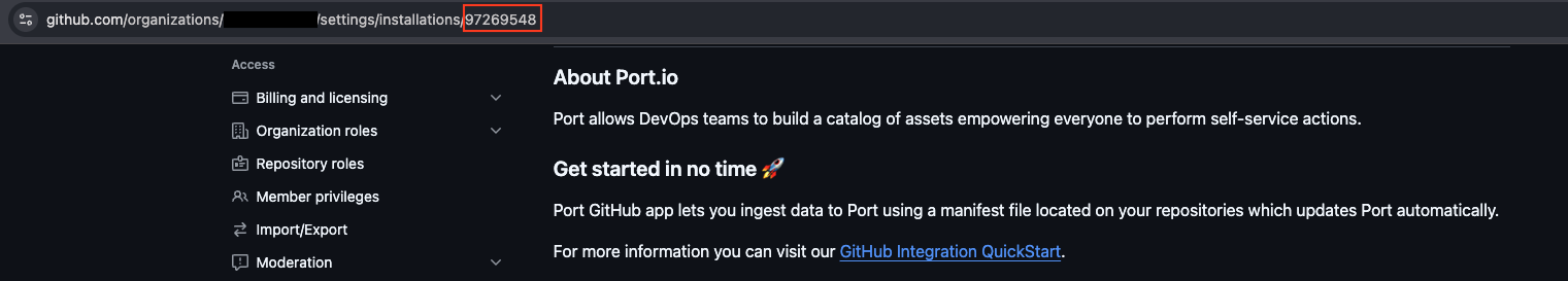 • The installation ID is the name you gave to the new GitHub Ocean integration when you created it