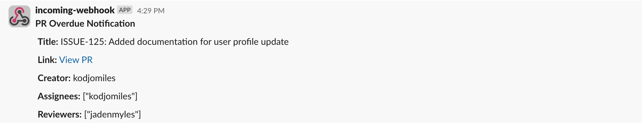 Here’s an example of the Slack message you’ll receive when a PR has been open for more than 3 days: