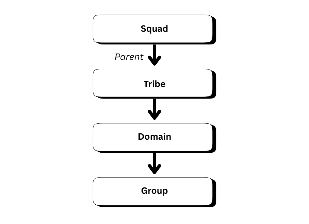 In this example, a group is comprised of one or more domains, which are comprised of one or more tribes, and so on.