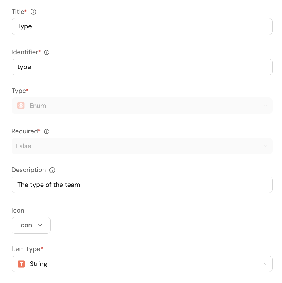 1. In the Team blueprint card, click on + New property, and choose Enum as the property type.