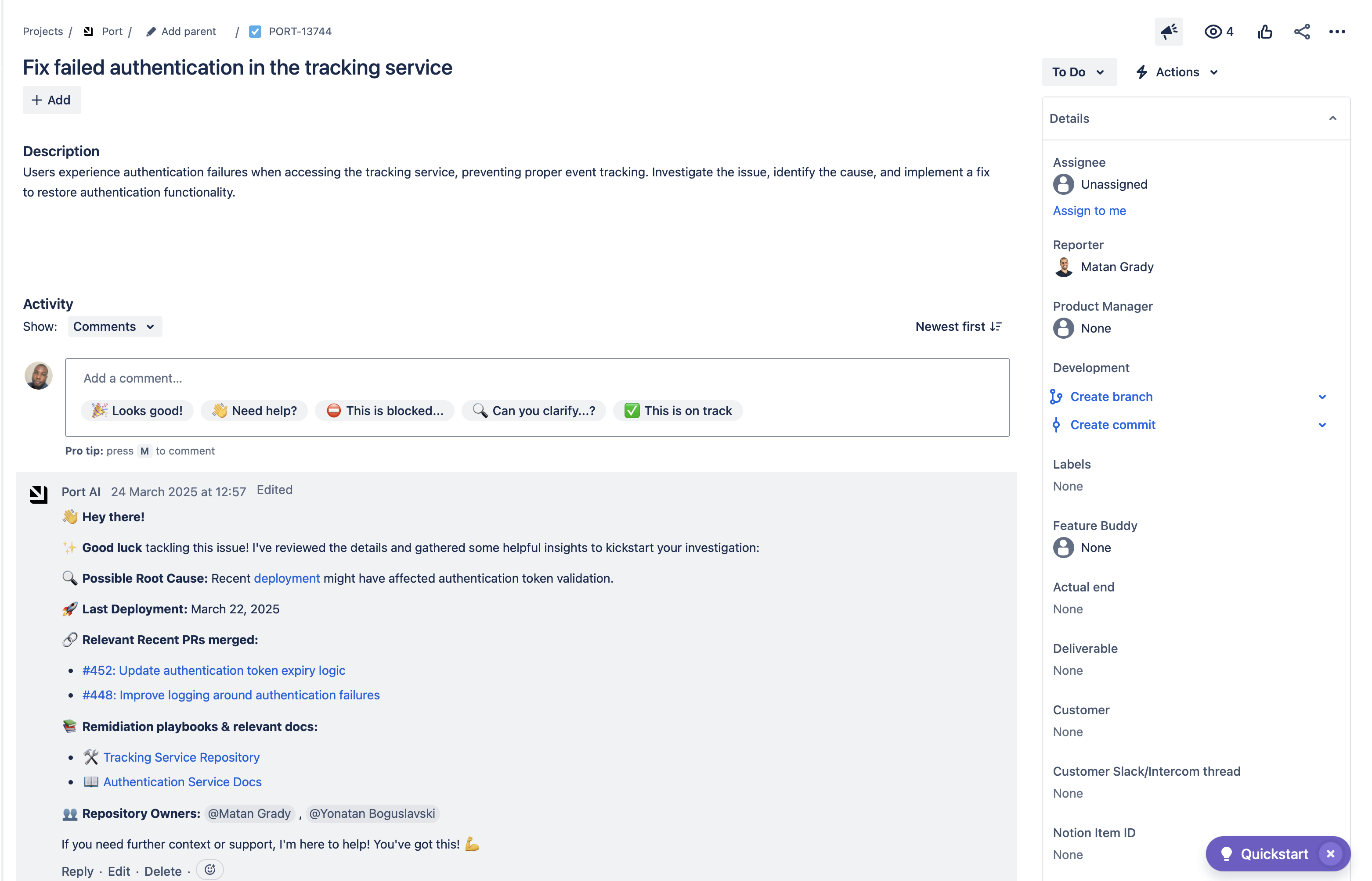 "prompt": "# Task\nUse the \"comment_on_jira_issue\" action, automatically send a greeting using their first name and explain this is an automatic message. Then share three sections with emojis for helpful context.\n\n## Message Format\nHey there [First Name], it's Clarity :crystal_ball: - the Port AI agent!\nI noticed you just started working on a new task: [link to assigned issue].\nHere's some context to help you get started :blobdance:\n\n:male-technologist: Devs who might have input:\nList up to 3 developers (excluding the user), explain briefly why each is relevant. If none, write a meaningful explanation.\n\n:jira: Similar Tasks:\nList up to 3 Jira issues (not assigned to the user), mention the assigned person and why it's relevant. If none, explain why.\n\n:github_on_fire: Similar Pull Requests:\nList up to 3 pull requests in statuses \"open\" or \"merged\", mention the creator and why it's relevant. If none, explain why.\n\n## Guidelines\n- Each section can have fewer than 3 items. Always explain\n",