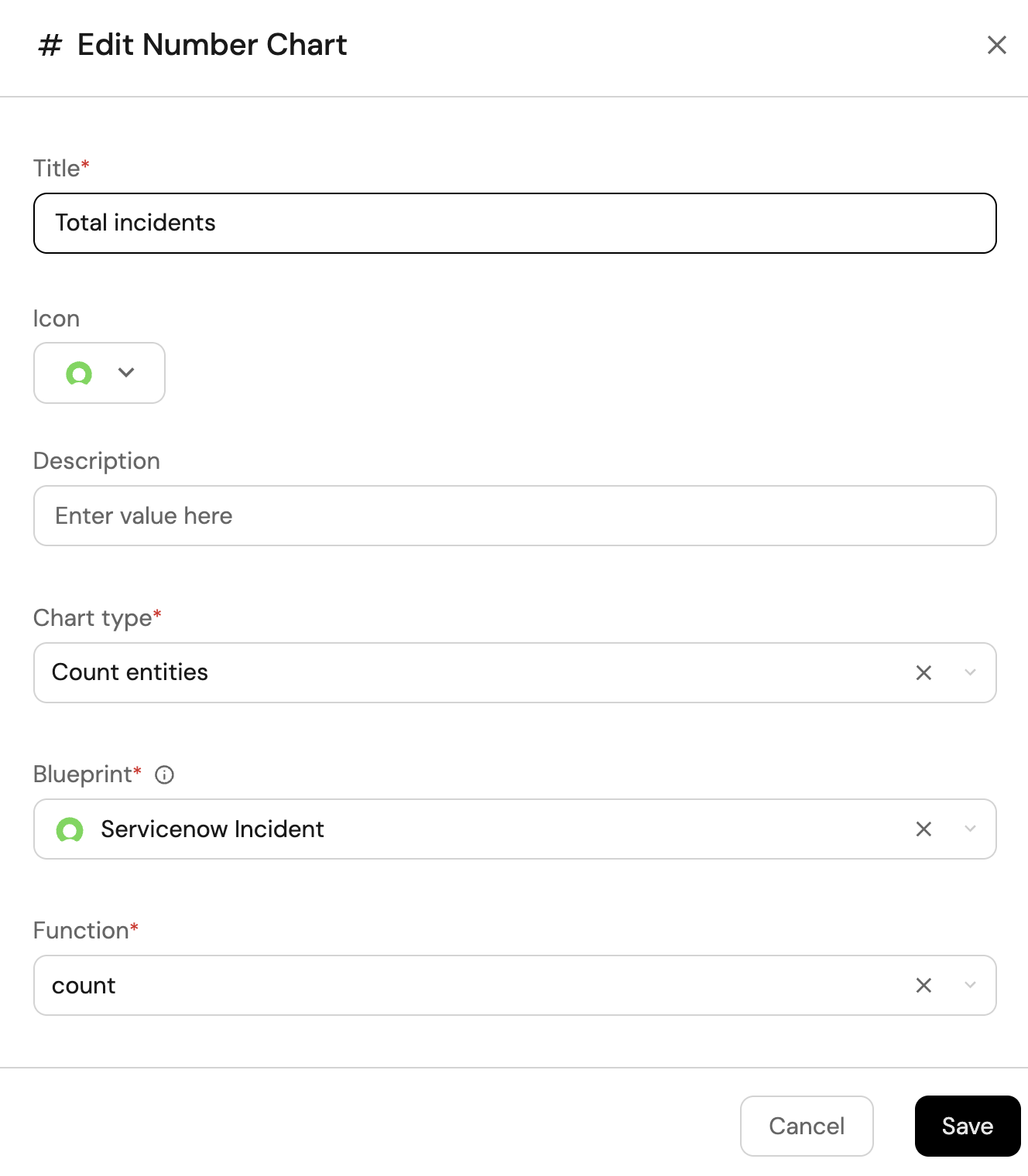 Count entitiesChart type and choose ServiceNow Incident as the Blueprint. -